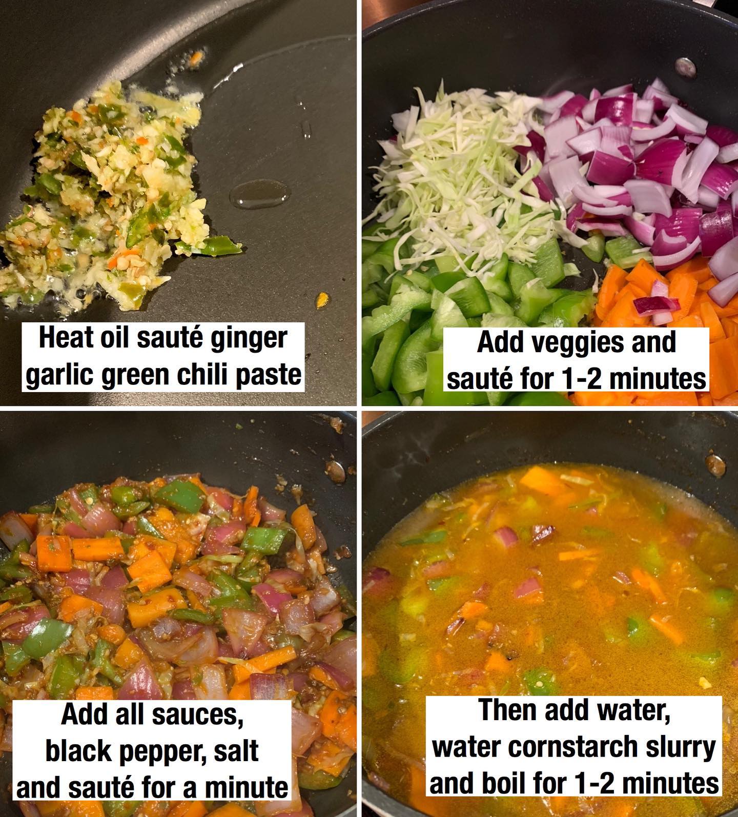 Add chopped onions, bell pepper,carrots and cabbage. Sauté for 1-2 minutes.