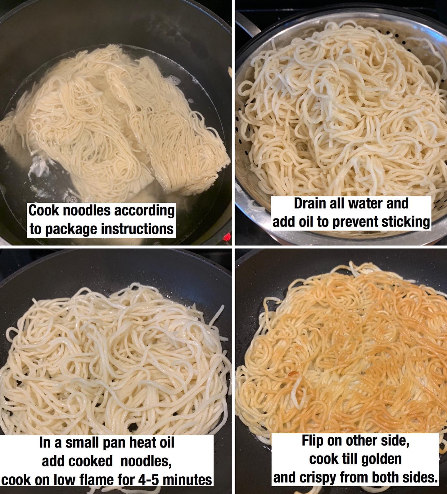 In a small pan heat 2-3 tbsp of oil. Add some noodles and spread in the pan. Cook on low flame for 4-5 minutes.