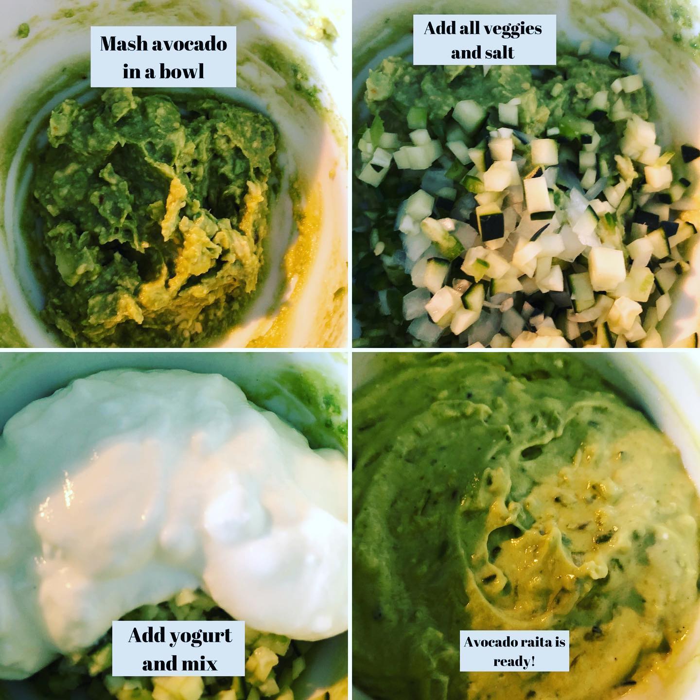 Avocado Raita!! You heard it right! I made this raita using avocado! Avocado is everybody’s favorite and we usually eat it with Mexican meals. Why not add it to our Indian menu aswell! A classic creamy Indian yogurt recipe which can be used as a refreshing dip or a side dish. Every house has their own raita recipe and it is made with a variety of vegetables and fruit combinations! From onions to tomatoes to cucumber or just plain raita with spices, the options are endless! I am pretty sure you might not have made raita using avocado! The creamy taste of avocado takes this raita to another level. I added finely chopped onions and cucumbers to give a nice texture to this creamy spiced yogurt!!