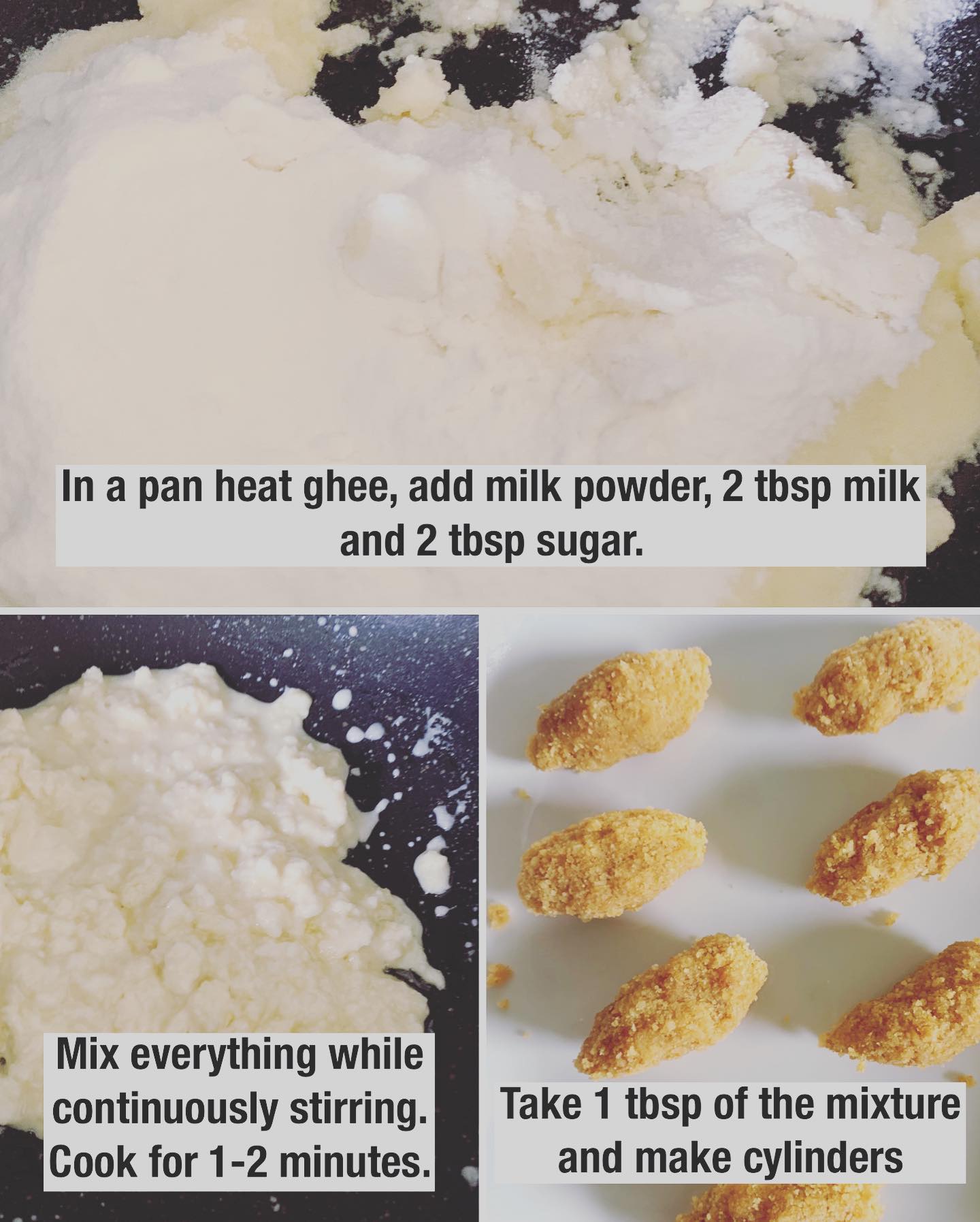 In a pan heat ghee, add milk powder, 2 tbsp milk and 2 tbsp sugar. Mix everything and continuously stir and cook for 1-2 minutes. Keep aside.