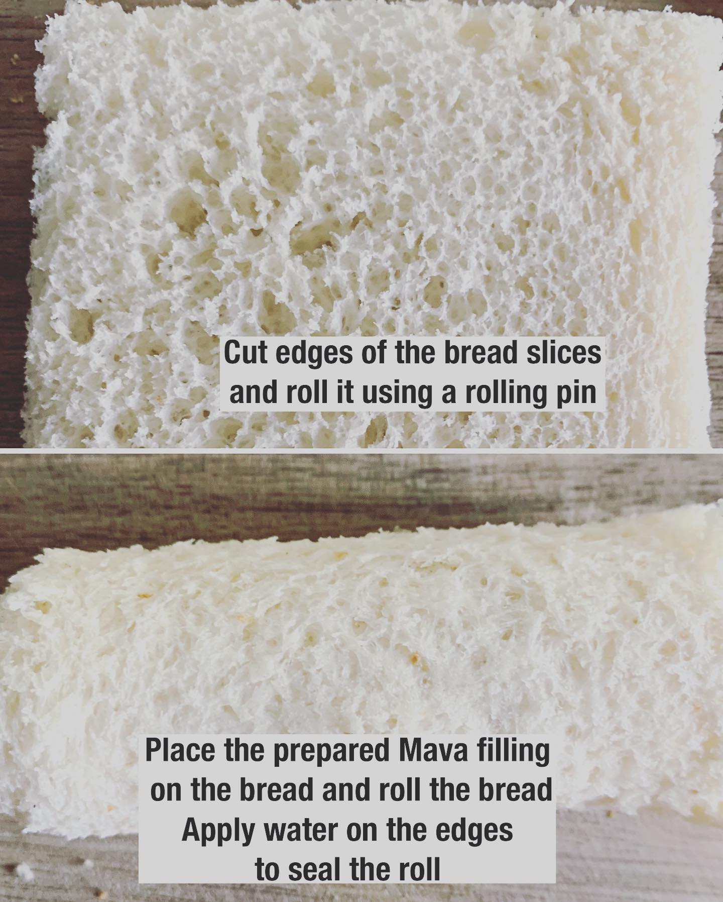 Place the prepared Mava filling on the edge of the bread and roll the bread . Apply water on the edges and seal.