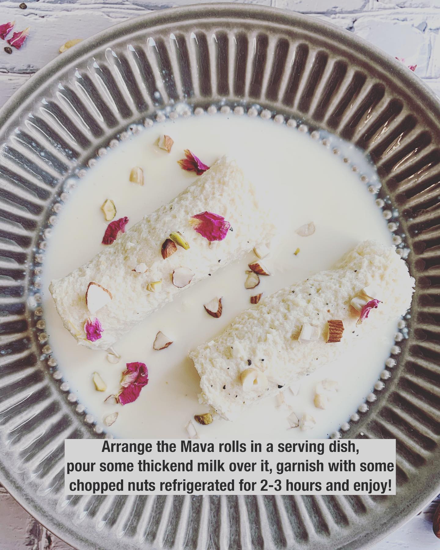 Arrange the Mava rolls in a serving dish, pour some thickend milk over it, garnish with some chopped nuts refrigerated for 2-3 hours and enjoy!