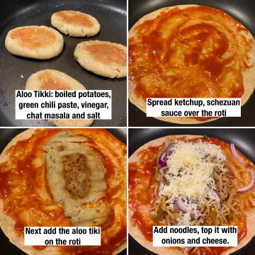 Next add the aloo tiki on the roti, then add noodles.