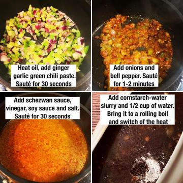 Add schezwan sauce, vinegar, soy sauce and salt. Sauté for 30 second.