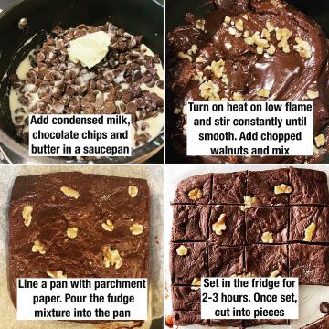 This amazing melt in the mouth fudge recipe requires only a few ingredients and 5 minutes. It is the best velvety, creamiest chocolate fudge ever! The perfect homemade chocolate candy. It is an easy and mess free recipe! Add this to your next fun activity with kids during the holidays! They will simply enjoy making this. Trust me it is so good you can’t just have one!! It will definitely be a crowd pleaser! Just combine chocolate chips and condensed milk, melt these two ingredients set in the fridge and enjoy! I added chopped walnuts to mine, to give a little crunch, but you can totally skip walnuts if you are not a nut fan. This is the easiest, no bake, quick dessert recipe you will ever make!! Make it over Rakhi and share your reviews @foodstoriesbytwisha