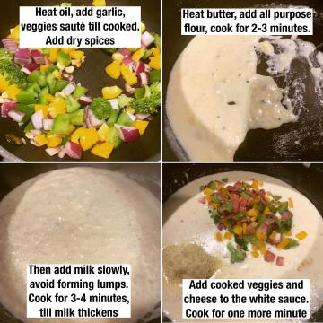 Add cooked veggies and cheese to the white sauce. Cook for one more minute and keep aside.