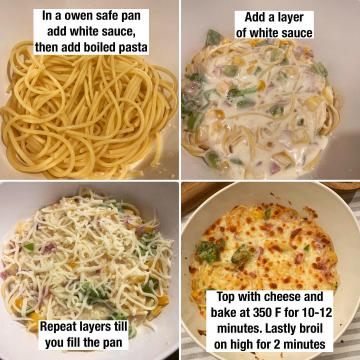 In a owen safe pan or bowl add white sauce on the bottom, then add boiled pasta, add a layer of white sauce.