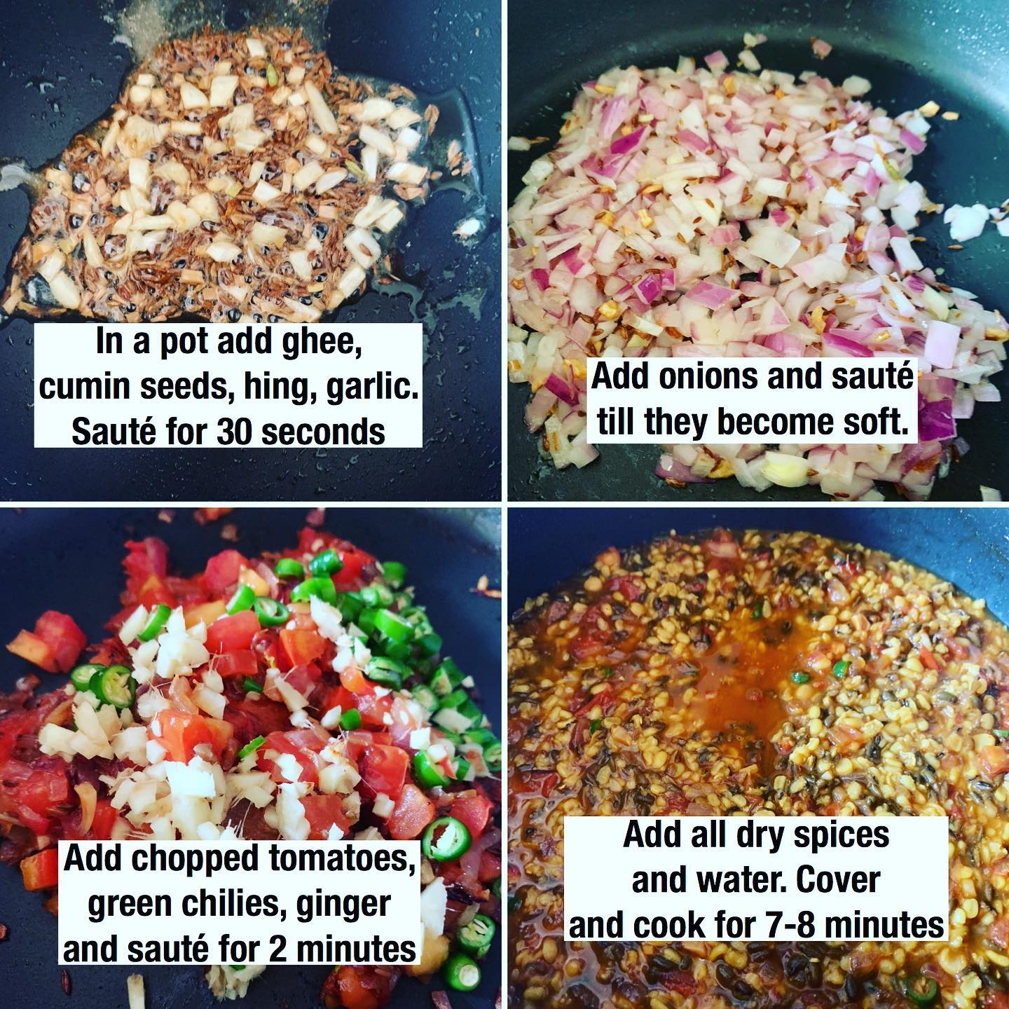 In a pot add ghee, cumin seeds, hing, garlic and onions. Sauté till onions turn soft.