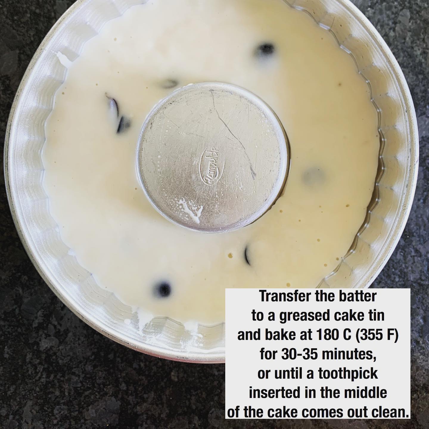 Bake at 180 C (355 F) for 30-35 minutes, or until a toothpick inserted in the middle of the cake comes out clean.