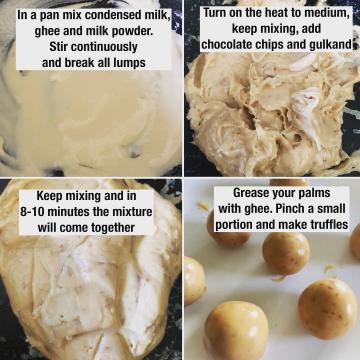 Grease your palms with ghee. Pinch a small portion and make golf ball size truffles.
