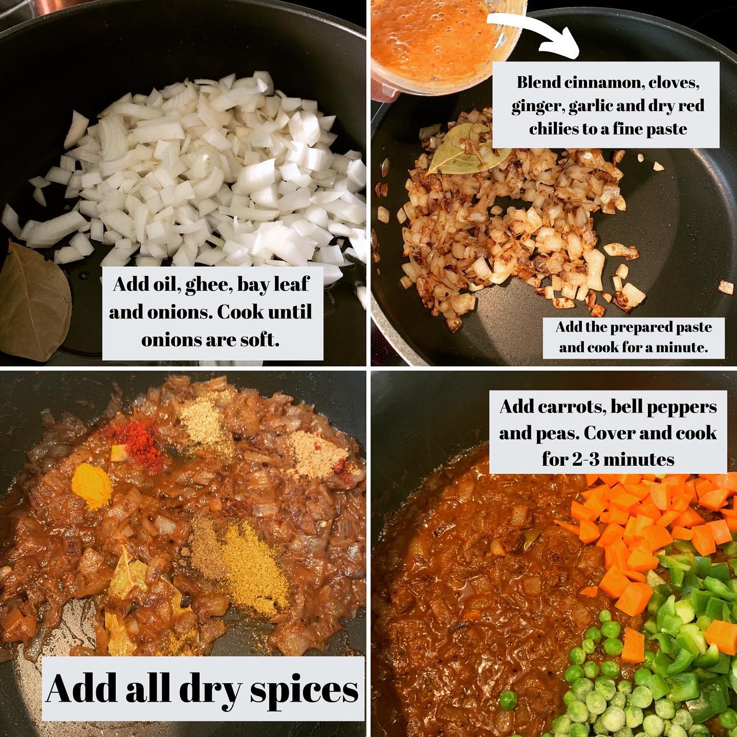 In a pan add ghee, bay leaf and onions. Cook until onions are soft.