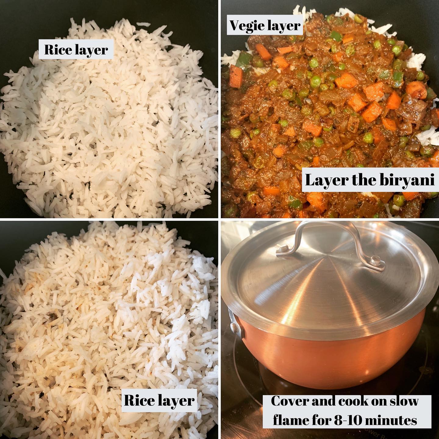 In a pot or handi layer rice and veggie mixture alternately and cook on a slow flame for 8-10 minutes.