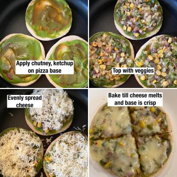 Top with as much or as little cheese and bake in an oven or a covered pan on a low flame till pizza is crispy from the bottom and cheese has melted.