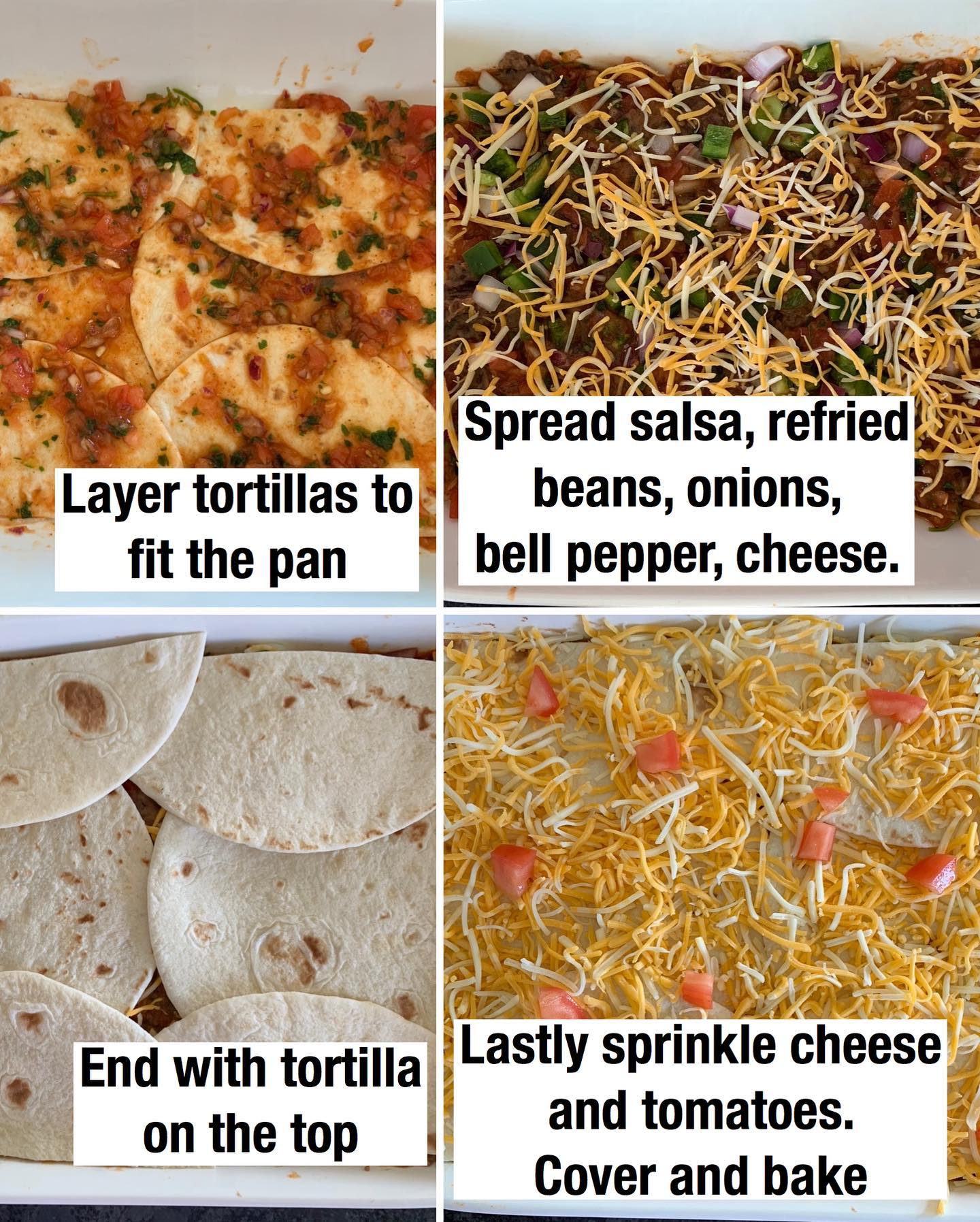 Spread 1/2 salsa, 1/2refried beans, 1/2onions, bell pepper, 1/3 cheese.