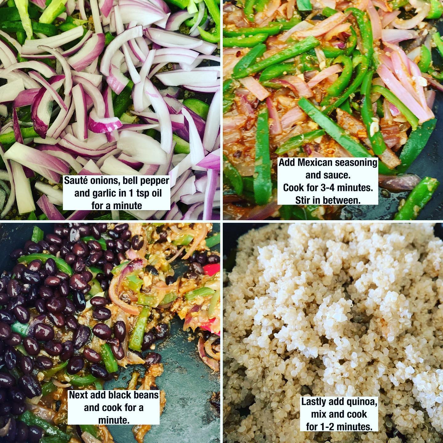 Quinoa has high protein. It has twice the amount of protein than the same quantity of rice. Plus it has high fiber content keeping you full for a longer time. Top it up with avocado one of our healthy fats and squeeze of lime! Making Mexican quinoa is really easy. Requires minimal prep. Just sauté vegetables, add beans and quinoa and dinner is ready!