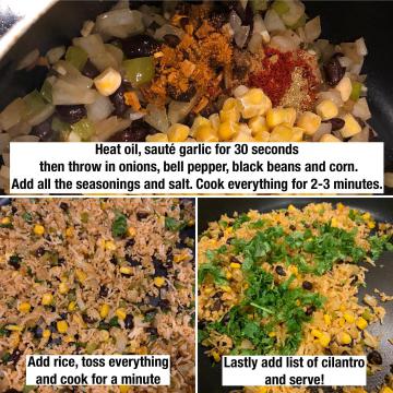 Then throw in onions, bell pepper, black beans, corn, all the seasonings and salt. Cook everything for 2-3 minutes.