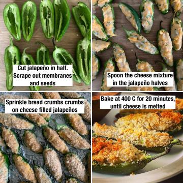 Sprinkle bread crumbs crumbs on cheese filled jalapeños.