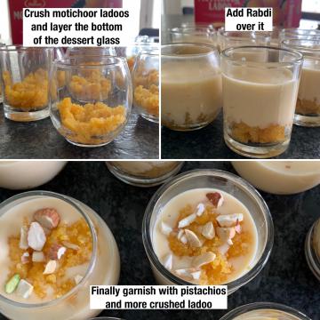 With Rakshabandhan coming up I am sharing some festive desert ideas! Motichoor Rabdi Parfait is a modern take on traditional Indian dessert. Classic sweetened thickened milk made by simmering milk is poured over sinfully delicious, melt in mouth motichoor ladoos. Garnish with choice of your nuts and serve! This amazing dessert is creamy and delicious which is very easy to put together. The presentation of this is so beautiful and will definitely make your guests want to go for second servings!
