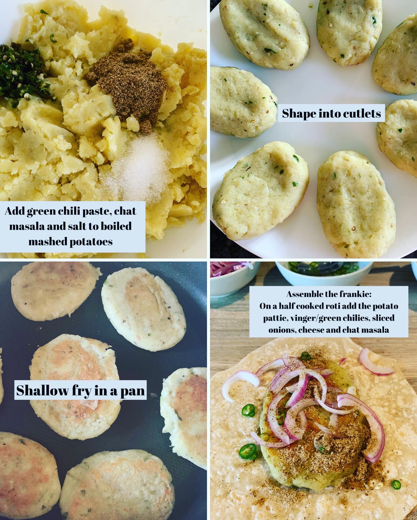 Take a roti, put the patty, onions, vinegar, cheese and sprinkle some chat masala.