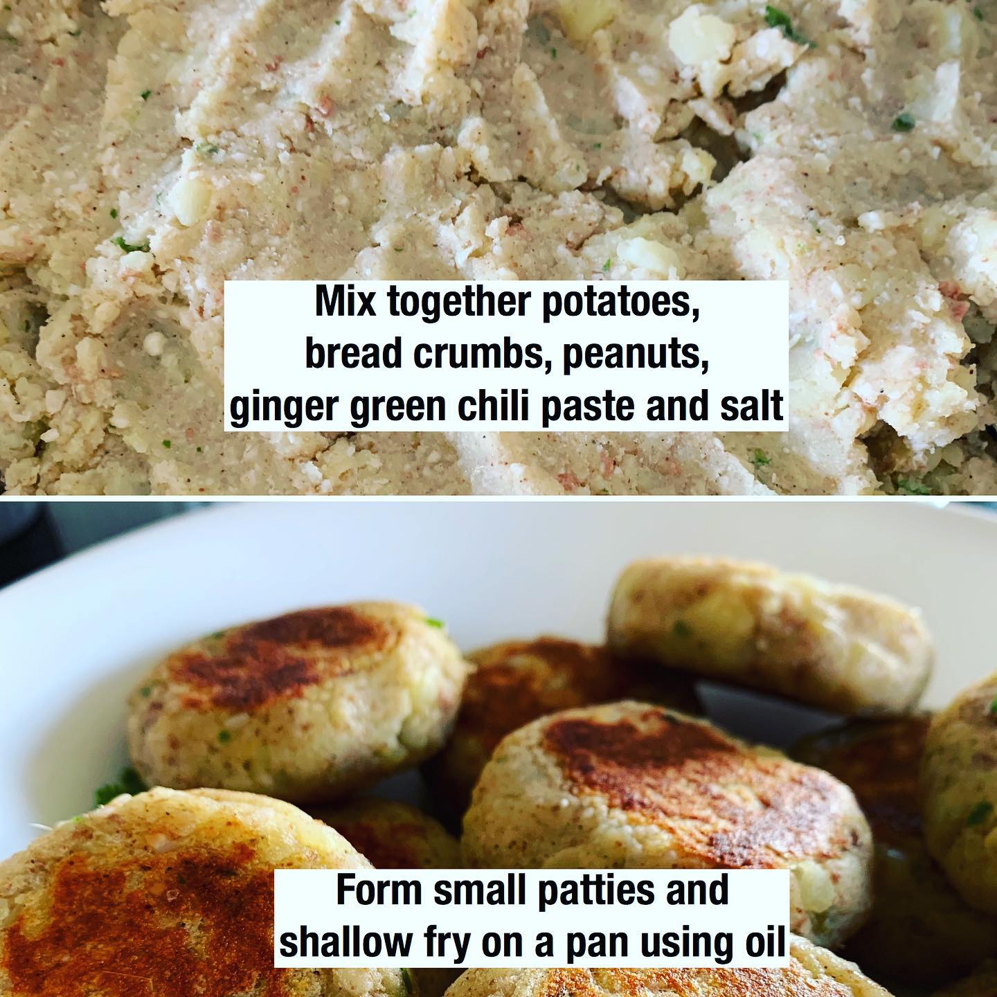Mix together potatoes, bread crumbs, peanuts, ginger green chili paste and salt.