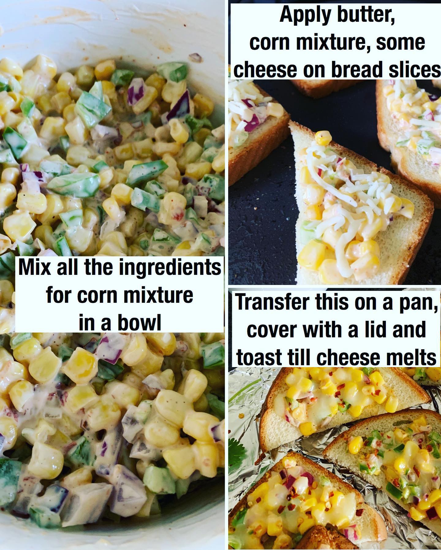 I make all types of toasts, this is just one of them! It works great as a breakfast, appetizer or tea time snack. You can keep the corn mixture prepped ahead of time and just toast the slices when you are ready to serve!