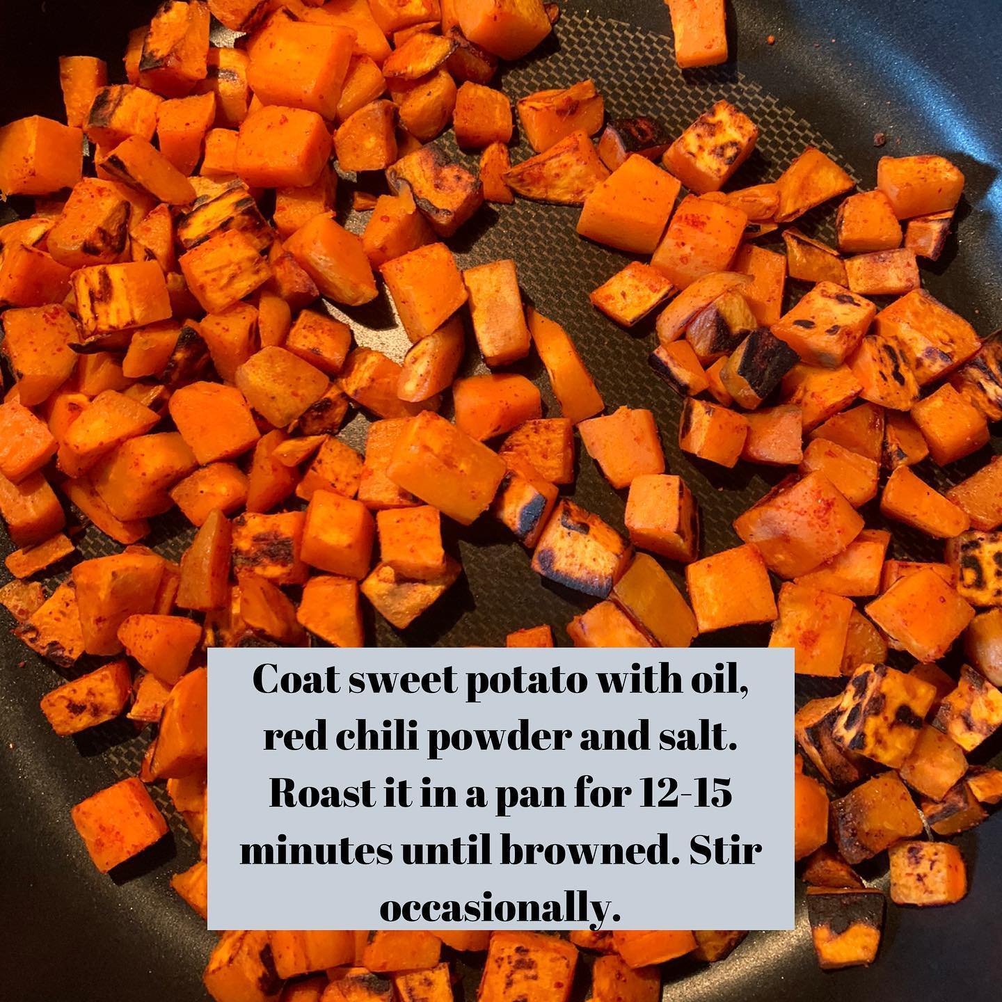 Roast sweet potatoes in a pan for 12-15 minutes until browned. Stir occasionally.
