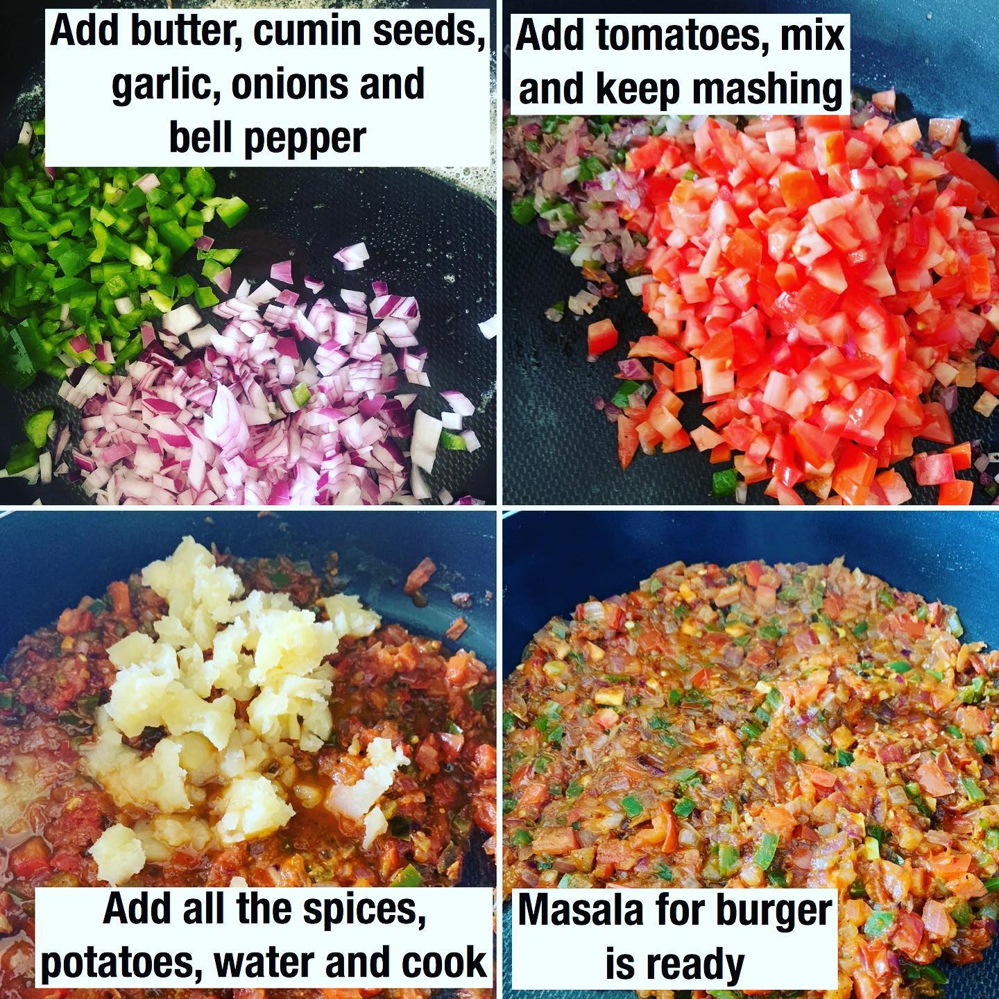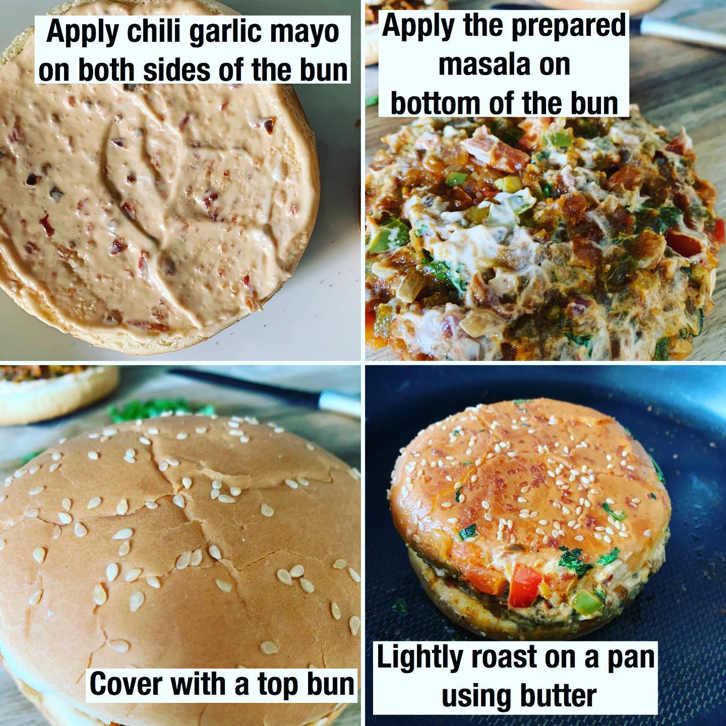 After eating the Mexican style black bean burgers, I was left with some burger buns. Decided to give a Desi twist to the burger and made these delicious tava burgers. As the name suggests, this is again a fusion recipe. The masaledar stuffing with creamy texture from chili-garlic mayo all blend together beautifully in each bite and will give you an out of the world experience. Do try this recipe if you are tired of eating the regular burgers and want to try something new.