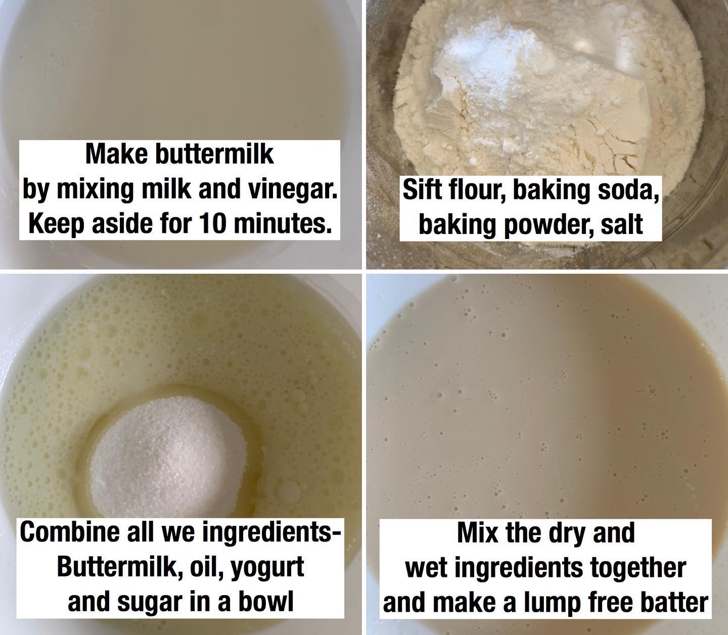 Combine all wet ingredients- buttermilk, oil, yogurt and sugar in a bowl.