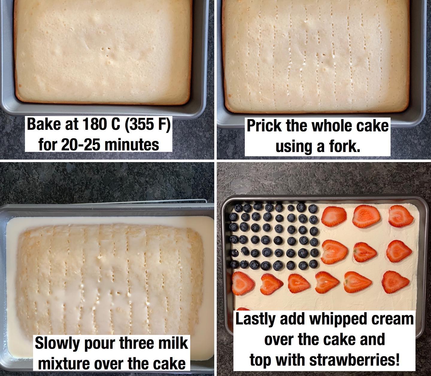 HAPPY 4th of JULY!! I always need a reason to bake and here I am again! Baked a super moist tres leches cake for America’s Independence Day! This scrumptious mexican cake drenched in three different milk and topped with whipped cream is delicious, yummy, creamy and whatever you can think of. The cake is so soft, it just melts in your mouth! This classic mexican cake is definitely a show stopper for your next gathering!!