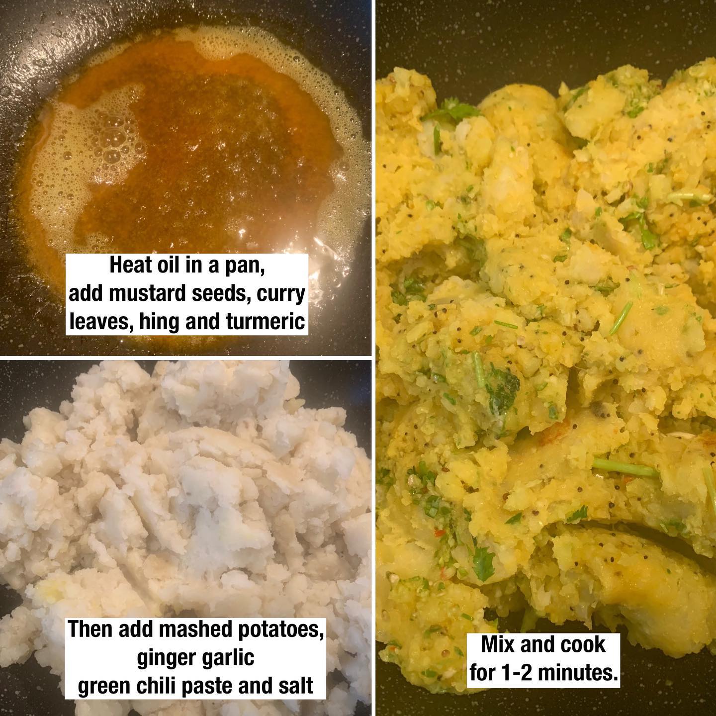 Once it crackles, add mashed potatoes, ginger garlic green chili paste and salt.