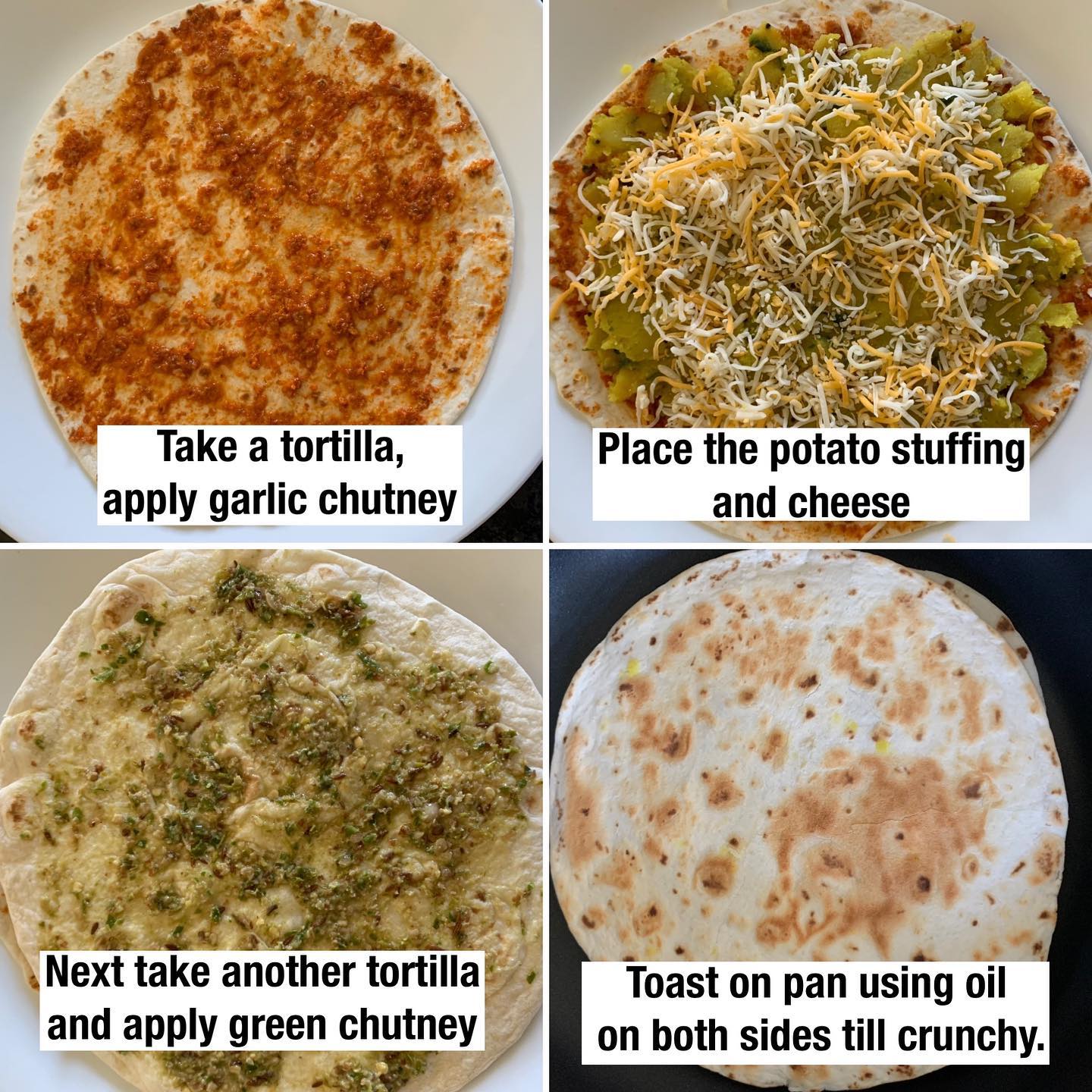 Vada pav quesadilla - Indian Mexican Fusion Recipe Yet another fusion recipe! I simply love to mixing international cuisine with Indian food. Potato filling with spicy chutneys, sandwiched in between tortillas. Drizzled with a creamy jalapeño-mayo sauce. Is you mouth watering yet!? Elevate your next party menu with this delicious recipe! It has the perfect vada pav taste with the fiesta flair of the quesadilla! The best part no frying is required and you can keep them ready and assembled. Just toast it when your guests arrive! These street style desi quesadilla will definitely wow your guests!