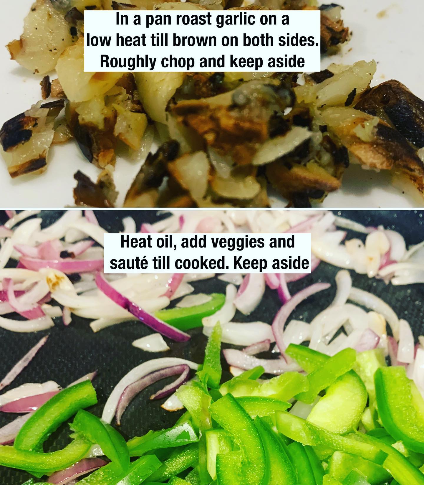 In a pan roast garlic on a low heat till brown on both sides. Roughly chop and keep aside.